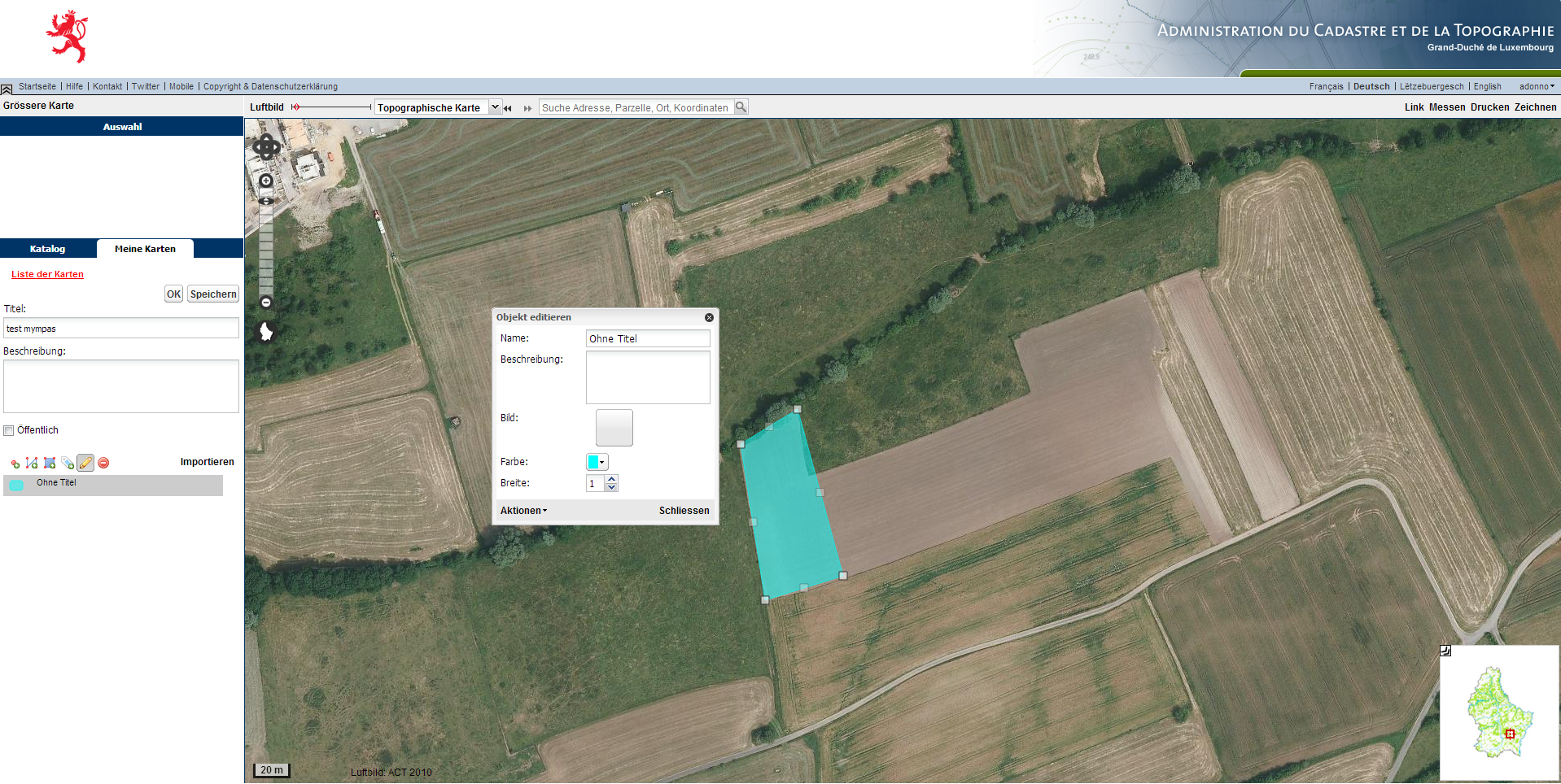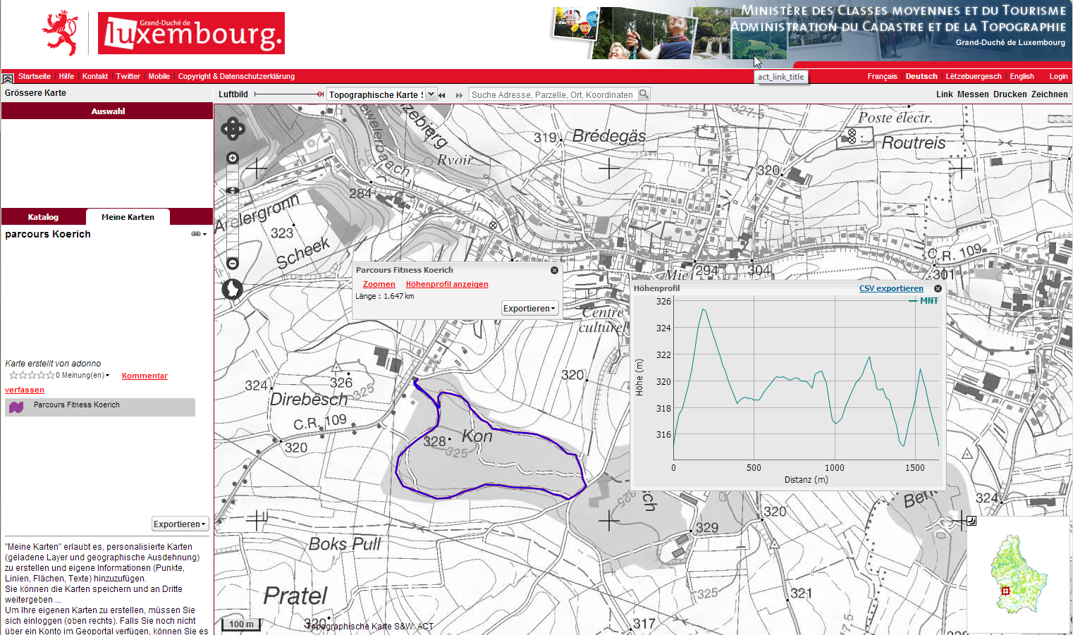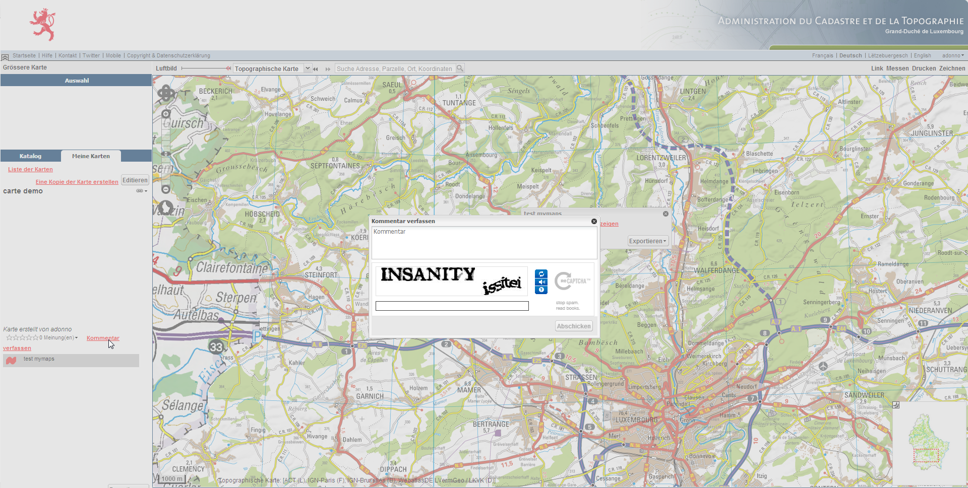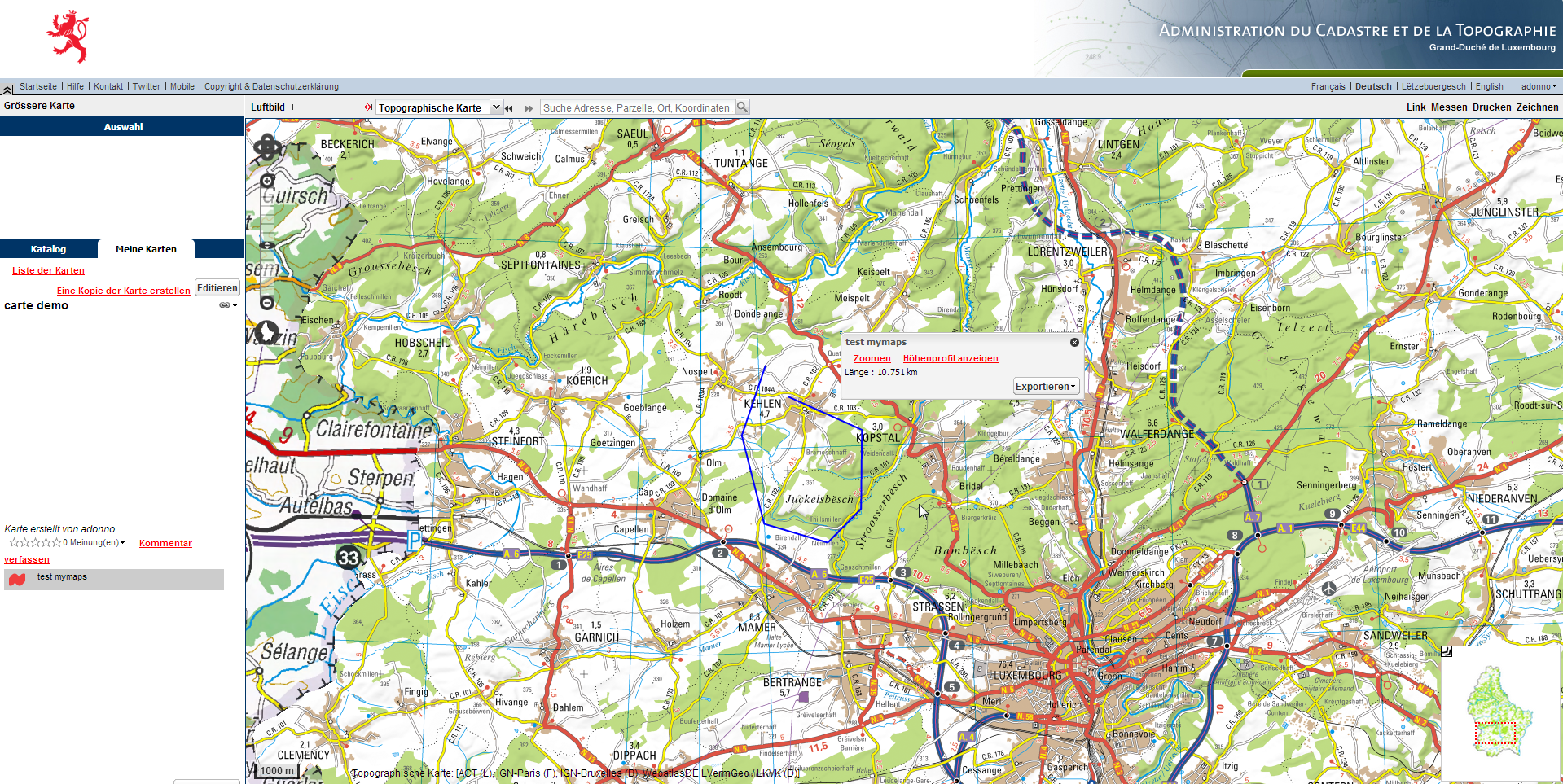 Die « Mymaps » Funktion des Geoportals ermöglicht es dem Benutzer, seine eigene Karte im Geoportal zu erstellen. Diese Karte wird gespeichert und kann anschließend über verschiedene Wege mit anderen Benutzern geteilt werden: