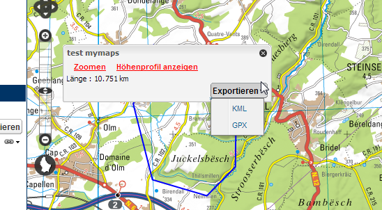 Ein Benutzer kann entweder eine ganze „mymaps“-Karte oder einzelne Objekte einer Karte im GPX oder KML Format exportieren.