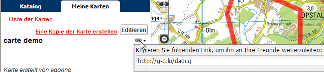 Jeder Benutzer kann seine Karte mit einem Dritten teilen indem er auf die „link“ Schaltfläche Kartentitel klickt. Es wird eine URL angezeigt die man anderen zuschicken kann und denen man damit Zugriff auf die Karte geben kann.