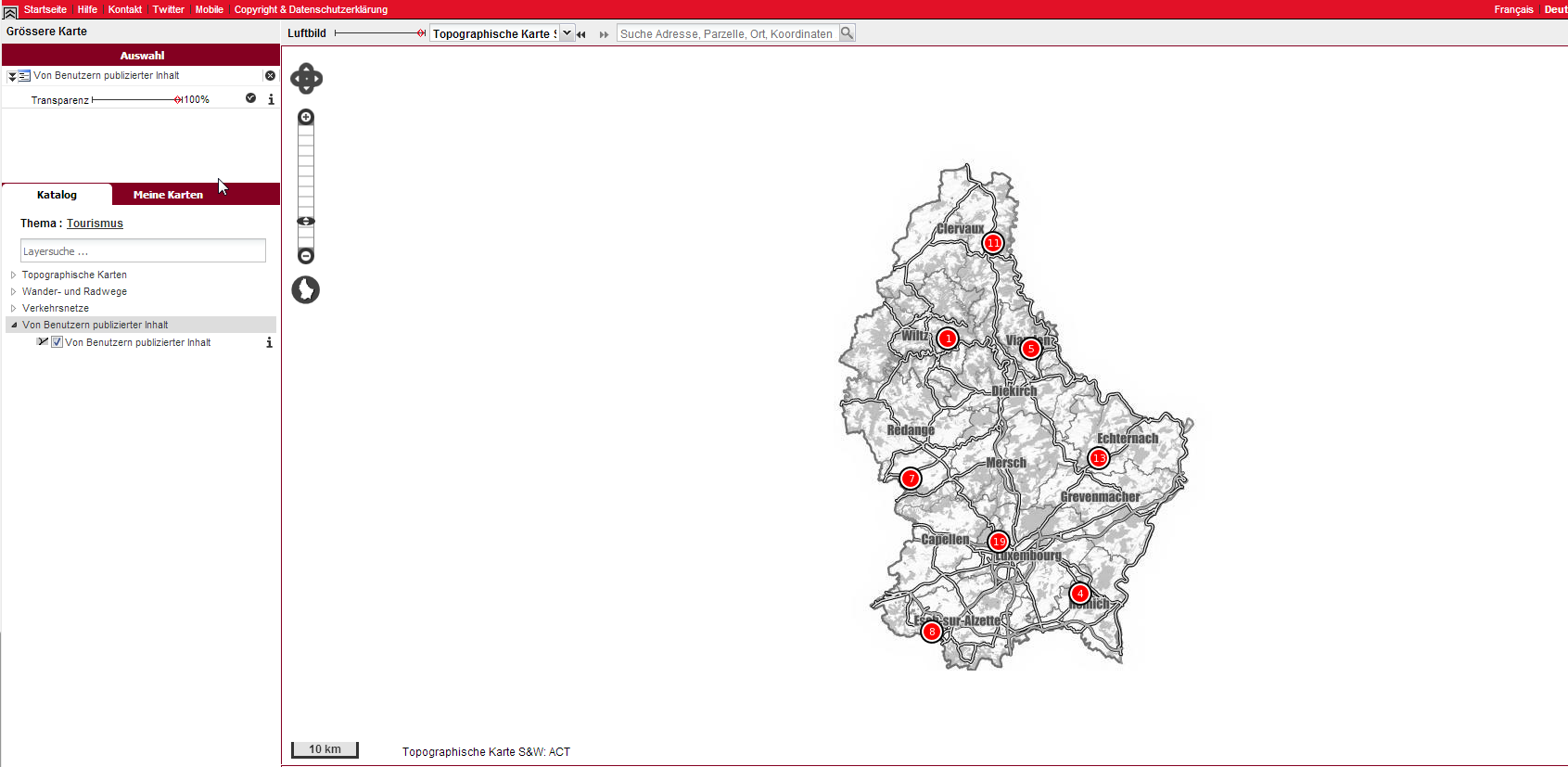 Wenn ein Benutzer das Kontrollkästchen „Öffentlich“ links unter der Beschreibung der Karte ankreuzt, veröffentlicht er seine Karte im Layer „von Benutzern publizierter Inhalt“ im Kartenportal tourisme.geoportal.lu