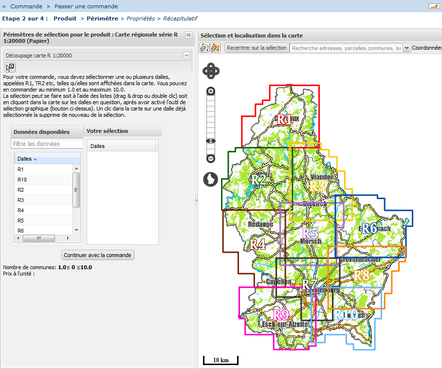 Comme on peut le voir, la carte est déjà divisée en plusieurs dalles (à l'echelle 1:20000) que vous pouvez ajouter ou retirer de votre sélection. Chaque dalle est représentée par une surface dont les contours sont dessinés en rouge.