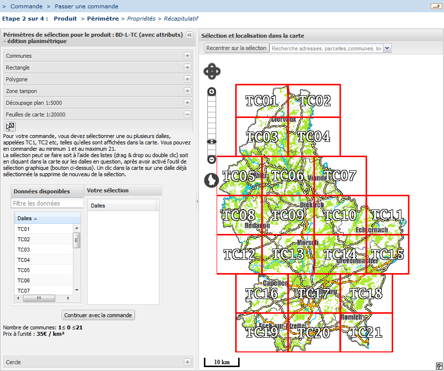 Comme on peut le voir, la carte est déjà divisée en plusieurs dalles (à l'echelle 1:20000) que vous pouvez ajouter ou retirer de votre sélection.